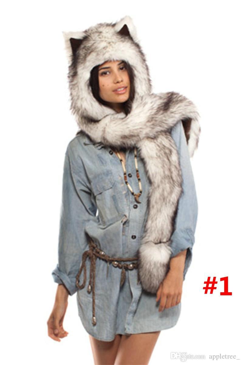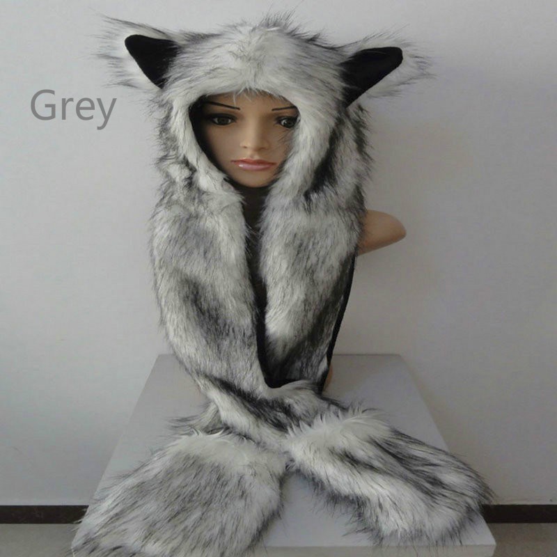 Dexing Faux Fur Hood Animal Hat Ear Long Scarf Gloves Fur Hood